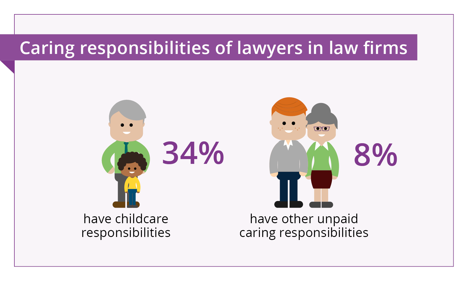 • 34% of lawyers had caring responsibilities for children, 8% had unpaid caring responsibilities for others with long-term physical or mental ill health.
