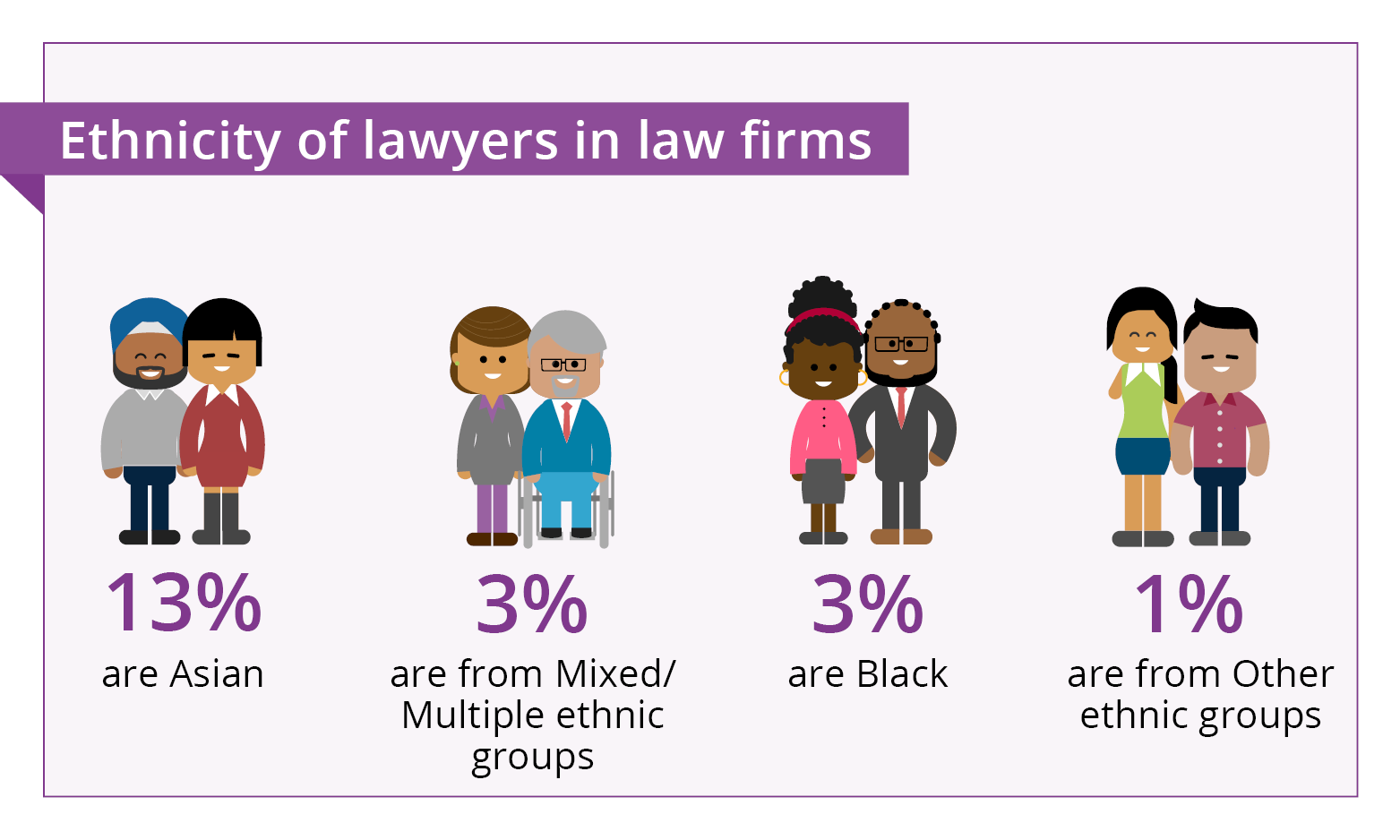 Diversity of lawyers in law firms graphic drawings of people represented in law firms, 55% are women, 20% are Black, Asian or minority ethnic, 8% are disabled