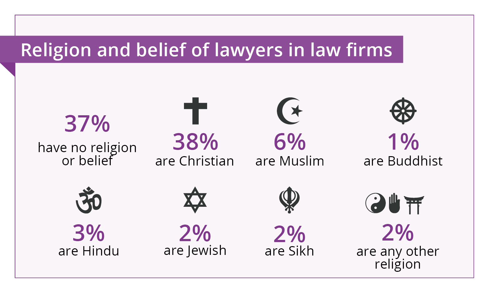 • 21% of lawyers in one-partner firms had no religion or belief compared with 42% in firms with 50+ partners